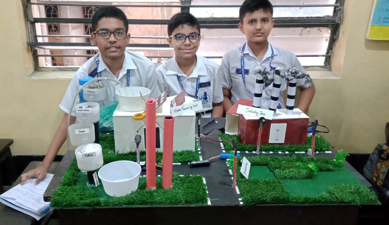 ছবিতে দেখা যায়, তিনজন ক্ষুদে শিক্ষার্থী তাদের তৈরি একটি প্রকল্প উপস্থাপন করছে। প্রকল্পটিতে পানি পরিশোধন ব্যবস্থা (Water Processing Unit), শিল্পাঞ্চল (Industry Zone) এবং পরিবেশবান্ধব অবকাঠামোর ধারণা তুলে ধরা হয়েছে। তারা বিভিন্ন উপকরণ যেমন—প্লাস্টিক বোতল, পাইপ, কৃত্রিম ঘাস, কাগজ ও রঙ ব্যবহার করে একটি বাস্তবধর্মী মডেল তৈরি করেছে।
